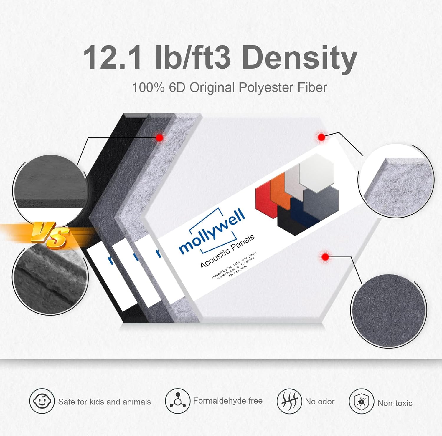 Mollywell Hexagon Acoustic Panels, High Density, Soundproofing, Decorative Noise Reduction Felt Wall Tiles for Studio, Office, Home (Silver Gray, Moon Gray, Black, White), 14x12x0.4 Inch