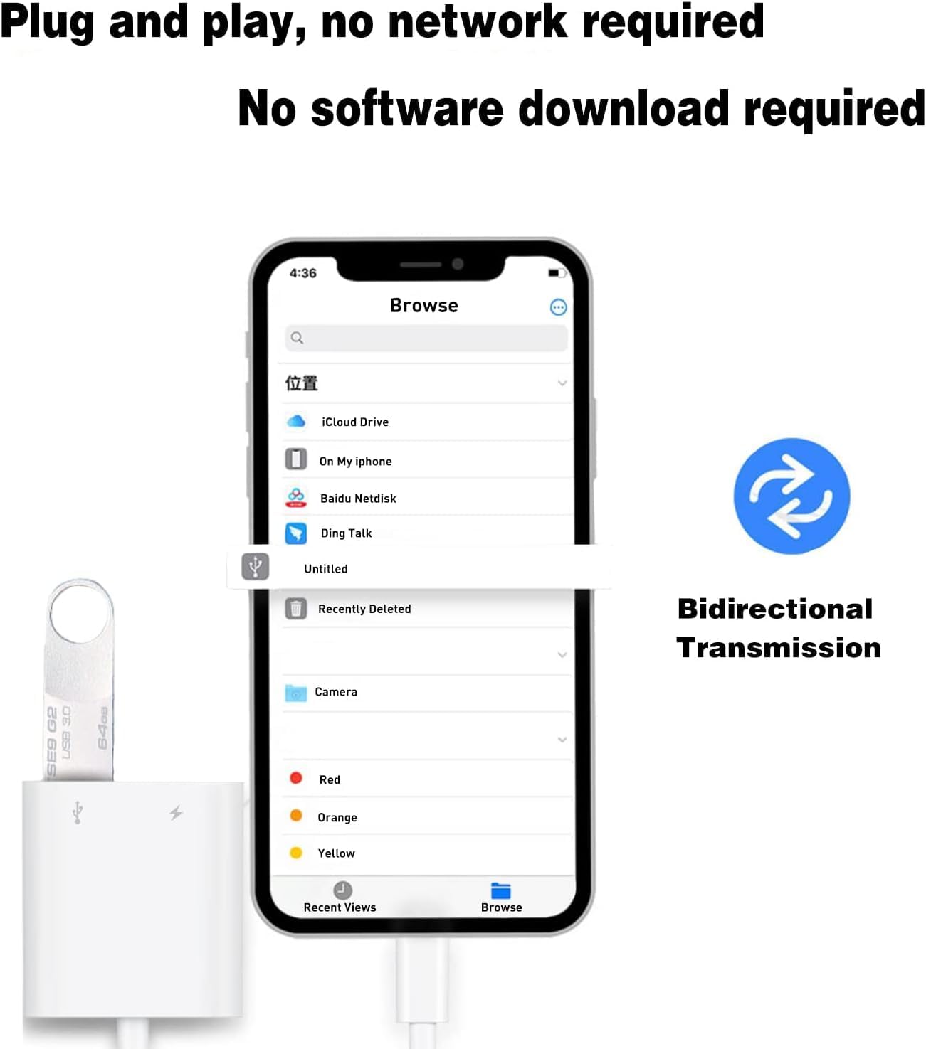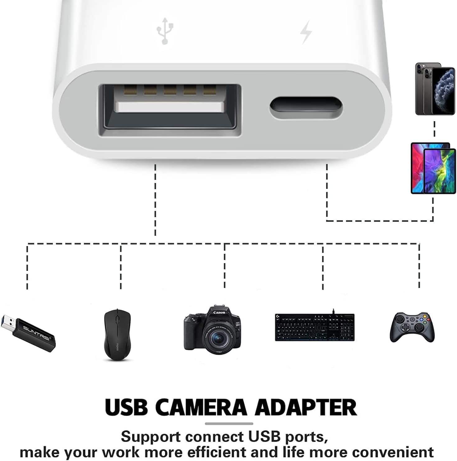 - 【Charge Your iPhone and iPad】: This USB adapter for iPhone adds a charging port for iPhone/iPad, charging, and viewing photos or videos can be operated at the same time. Don't worry about the power shortage of your phone anymore. More importantly, this USB-to-iPhone adapter can also allow you to share battery power with your friends and solve your friends' urgent needs.