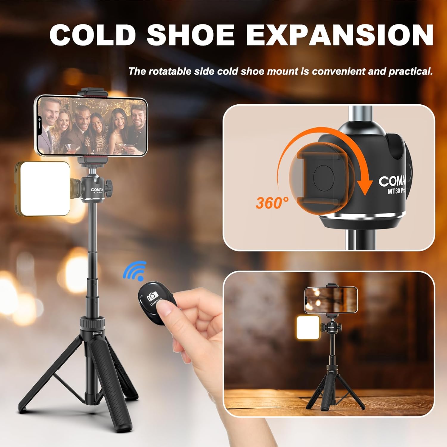 - 【3 IN 1 Camera Tripod Stand】 COMAN MT30-PRO phone tripod made of high quality aluminum alloy and ABS plastic, It is a combination of selfie stick tripod, desktop phone stand and camera tripod all in one small package, perfect for portraits, selfies, vlogging, photography, and video recording