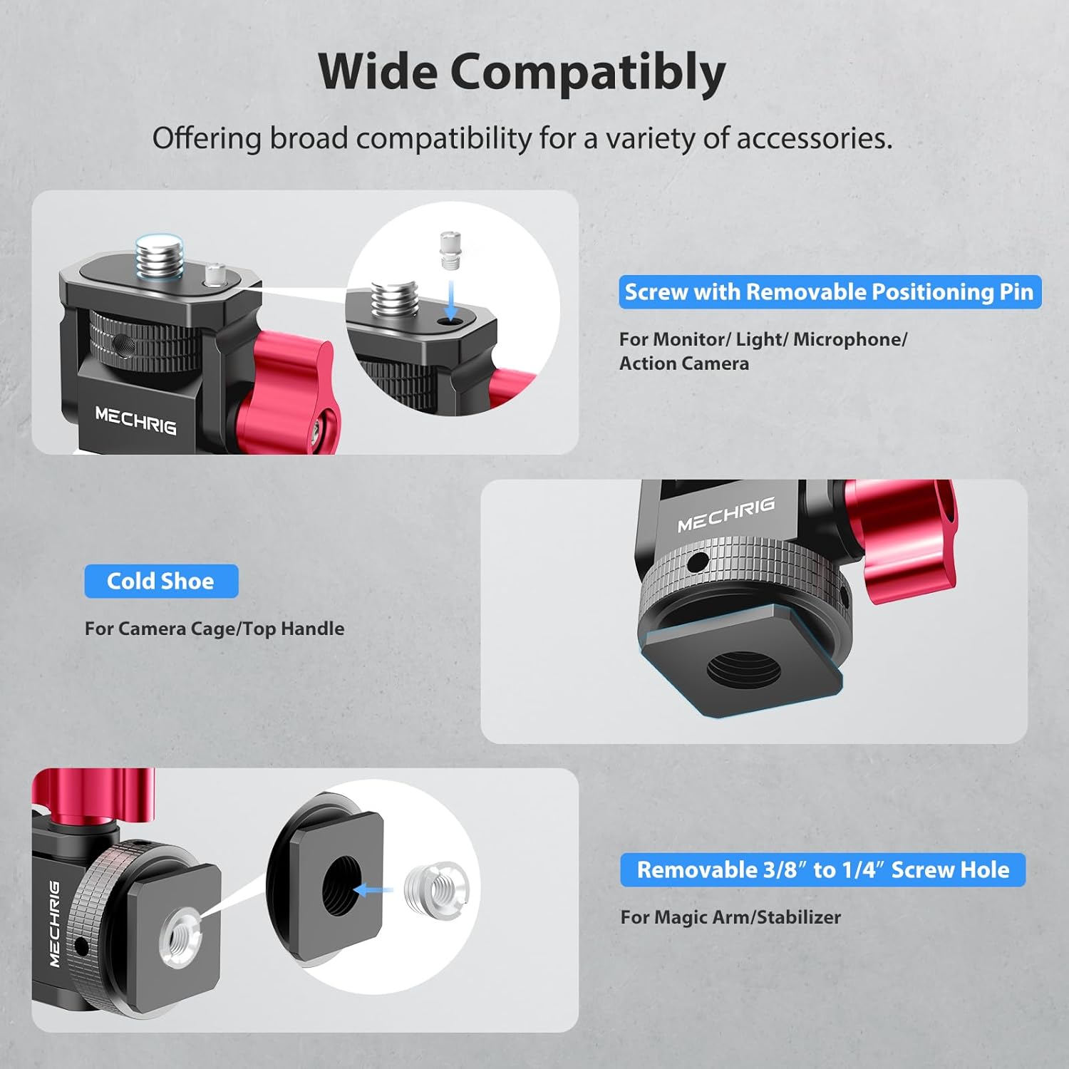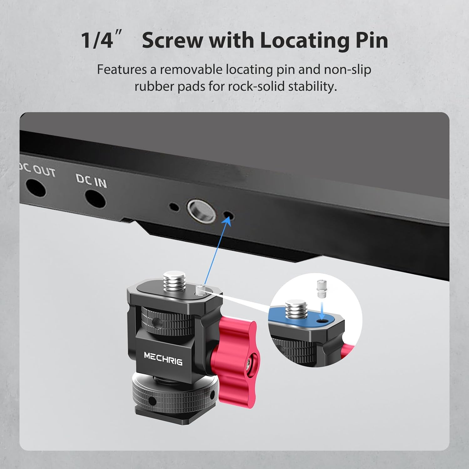 - Versatile Camera Monitor Mount with Cold Shoe: Mini Camera Monitor Mount features a built-in cold shoe for attaching to camera, camera cages or brackets. The cold shoe also includes a removable 1/4" to 3/8″ screw hole for compatibility with magic arms or stabilizers, making it perfect for on-the-go filmmakers and photographers