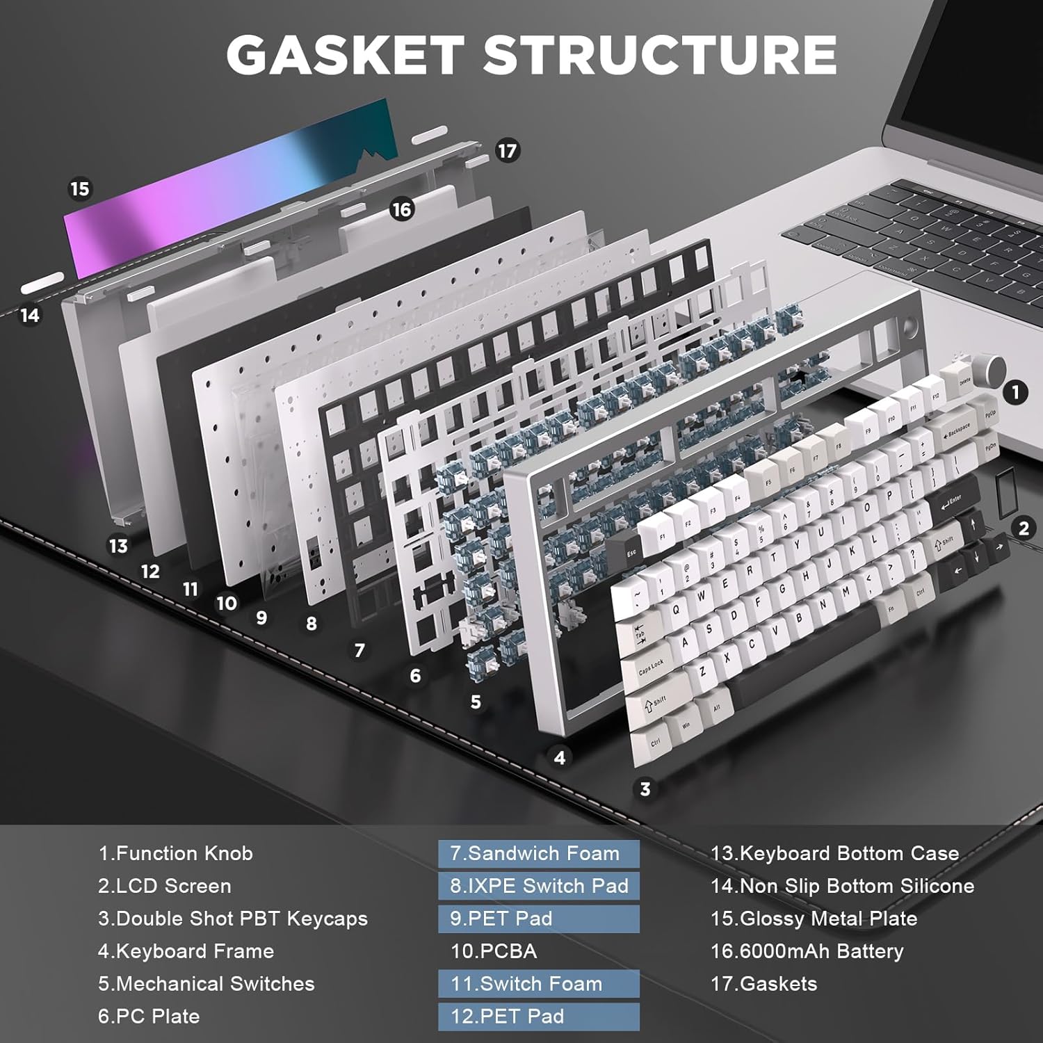 - Custom LCD Keyboard &Vibrant RGB: YUNZII AL80 wireless mechanical keyboard features a customizable LCD screen that can display time, GIFs, photos, battery status, connection mode, and more. The RGB gaming keyboard has over 20 backlight modes,1.68 million RGB colors and south-facing LEDs. Shortcut keys or drivers support adjusting various dynamic RGB effects, allowing you to experience the infinite fun of RGB.