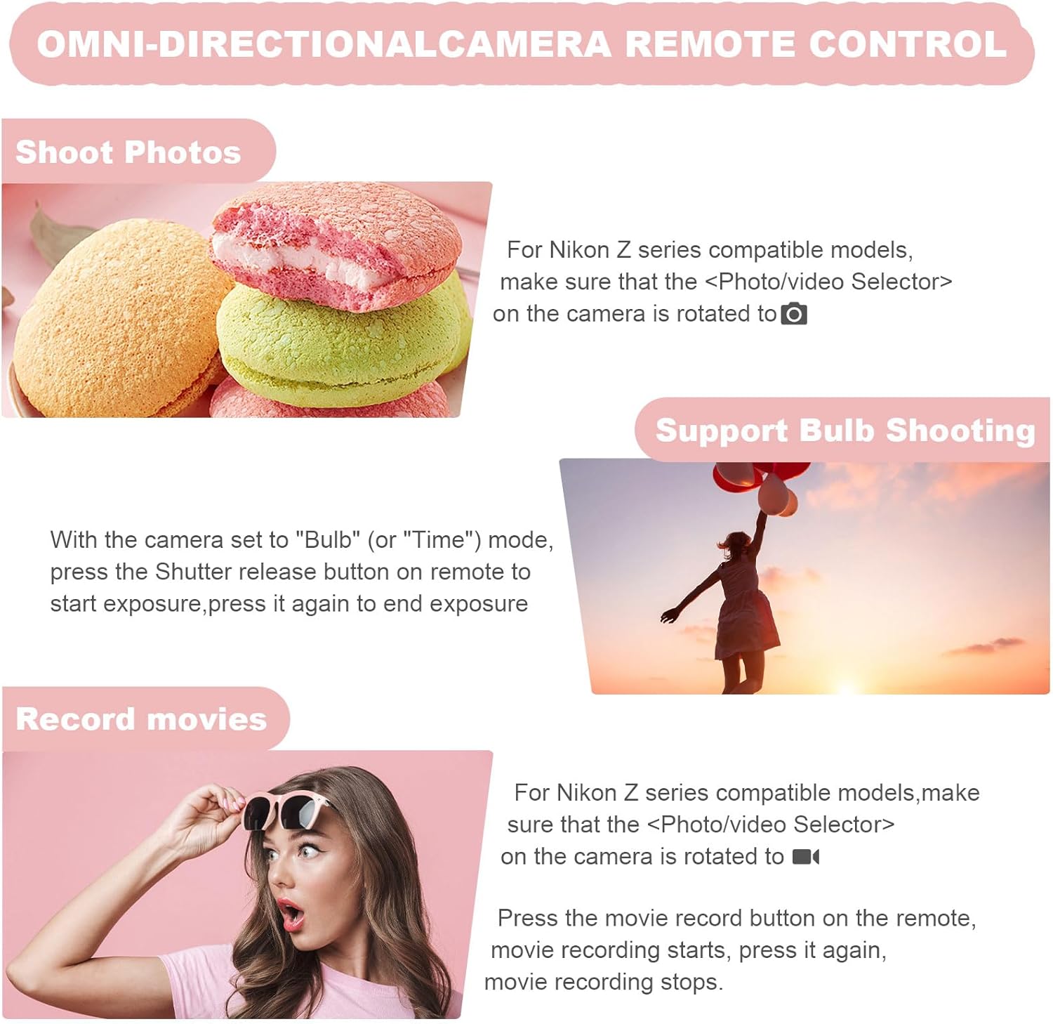- Compatible with Nikon models: Z6 III, Z30, Z50, Z50II, Zfc, Zf; Z6II, Z7II, Z5 (with V1.40 or later firmware update); Coolpix A1000, B600, P1000, P950. Please note :Z series cameras do not support remote zooming of the lens, but remote zooming of the previewed image is supported. A1000, P1000, and B600 do not support assigning functions to the Fn1 and Fn2 buttons on the remote control.