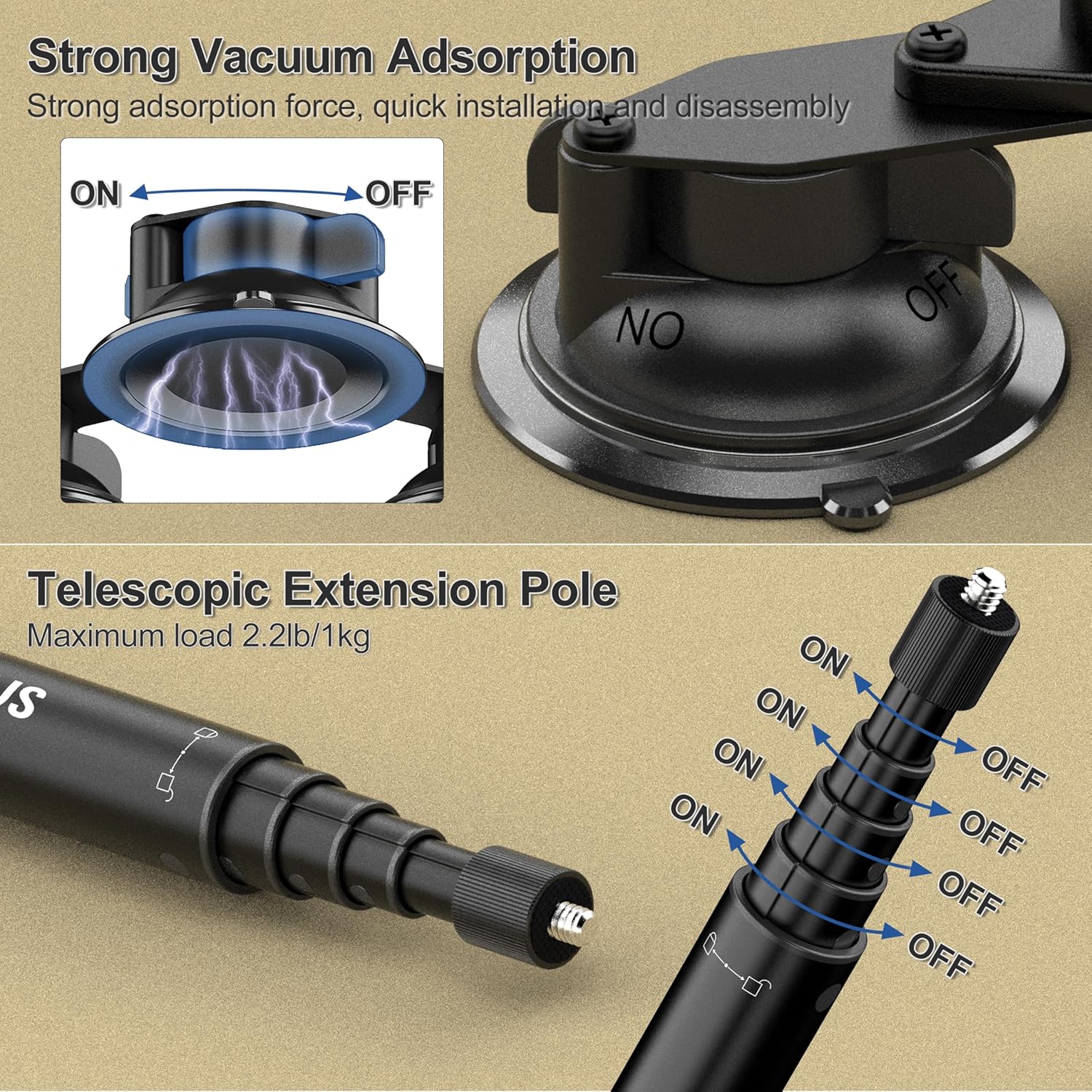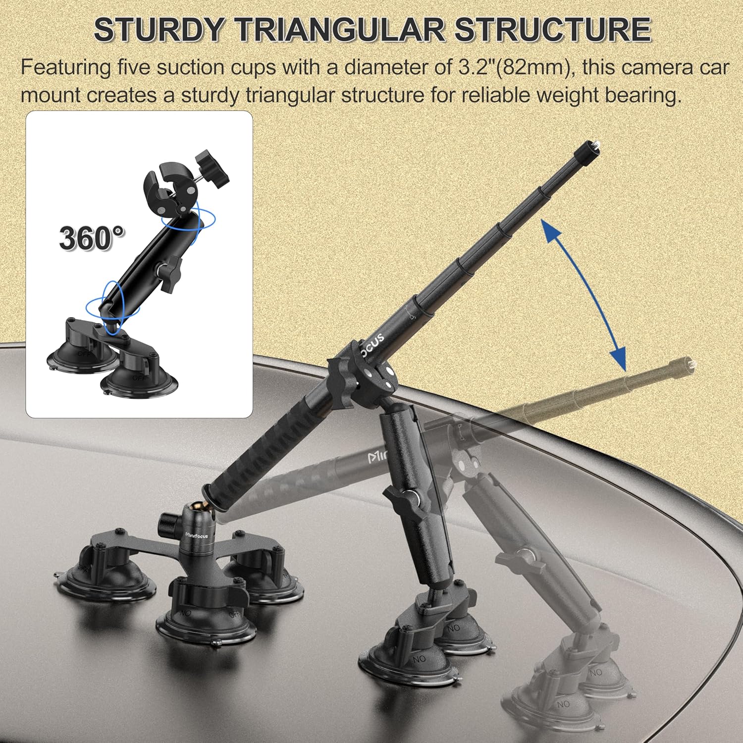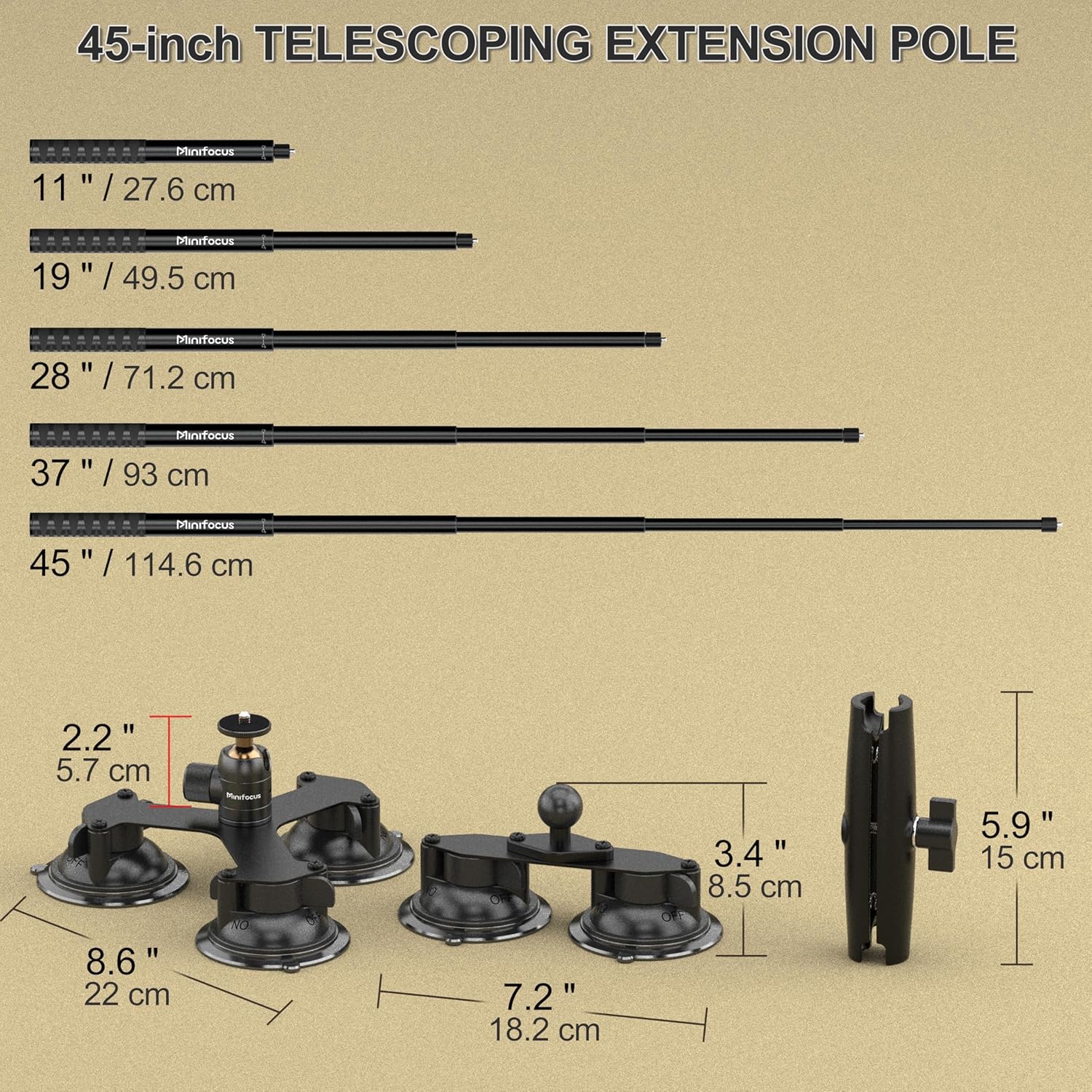 MINIFOCUS Suction Car Mount for Insta360 X5, X4, X3, 5 in 1 Suction Cup Camera Mount Kit with 2in1 Extension Pole, Compatible with Insta360 GoPro Action Camera(Includes 45inch Invisible Selfie Stick)