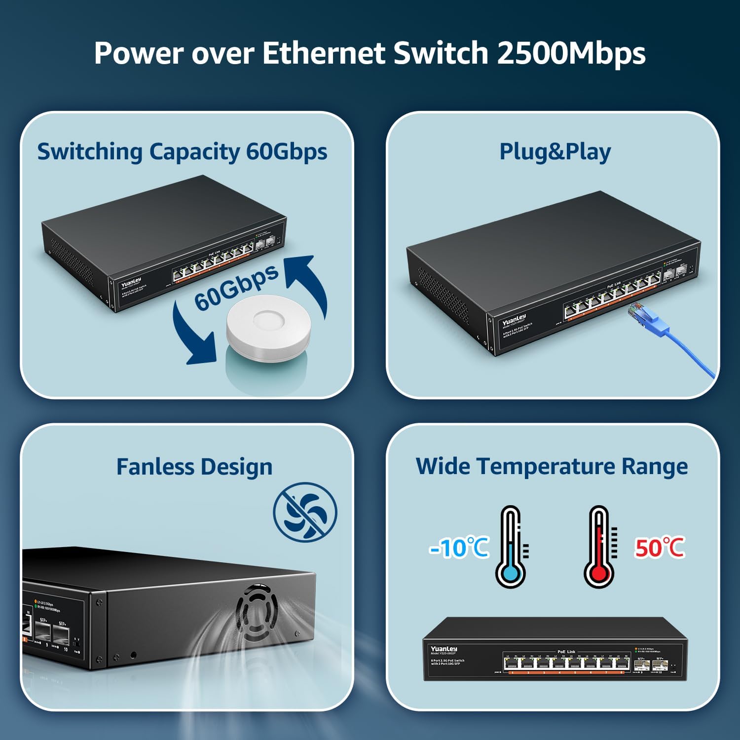 YuanLey 10 Port 2.5G PoE Switch Unmanaged, 8 x 2.5G Base-T PoE Ports, 2 x 10G SFP, IEEE802.3af/at, 120W, Compatible with 100/1000/2500Mbps, Metal Fanless, Desktop/Rack Mount 2.5Gbe Network Switch