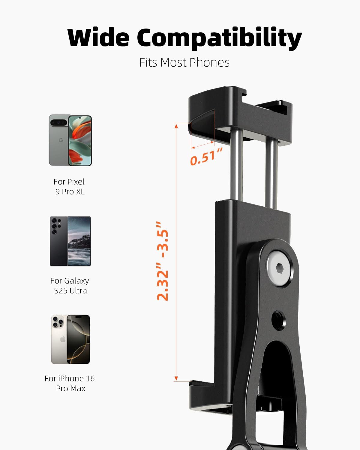 - Universal Phone Compatibility: Adjusts from 2.32" to 3.5" to securely grip all smartphones. Works as a standalone phone camera mount or with tripod phone holder systems
