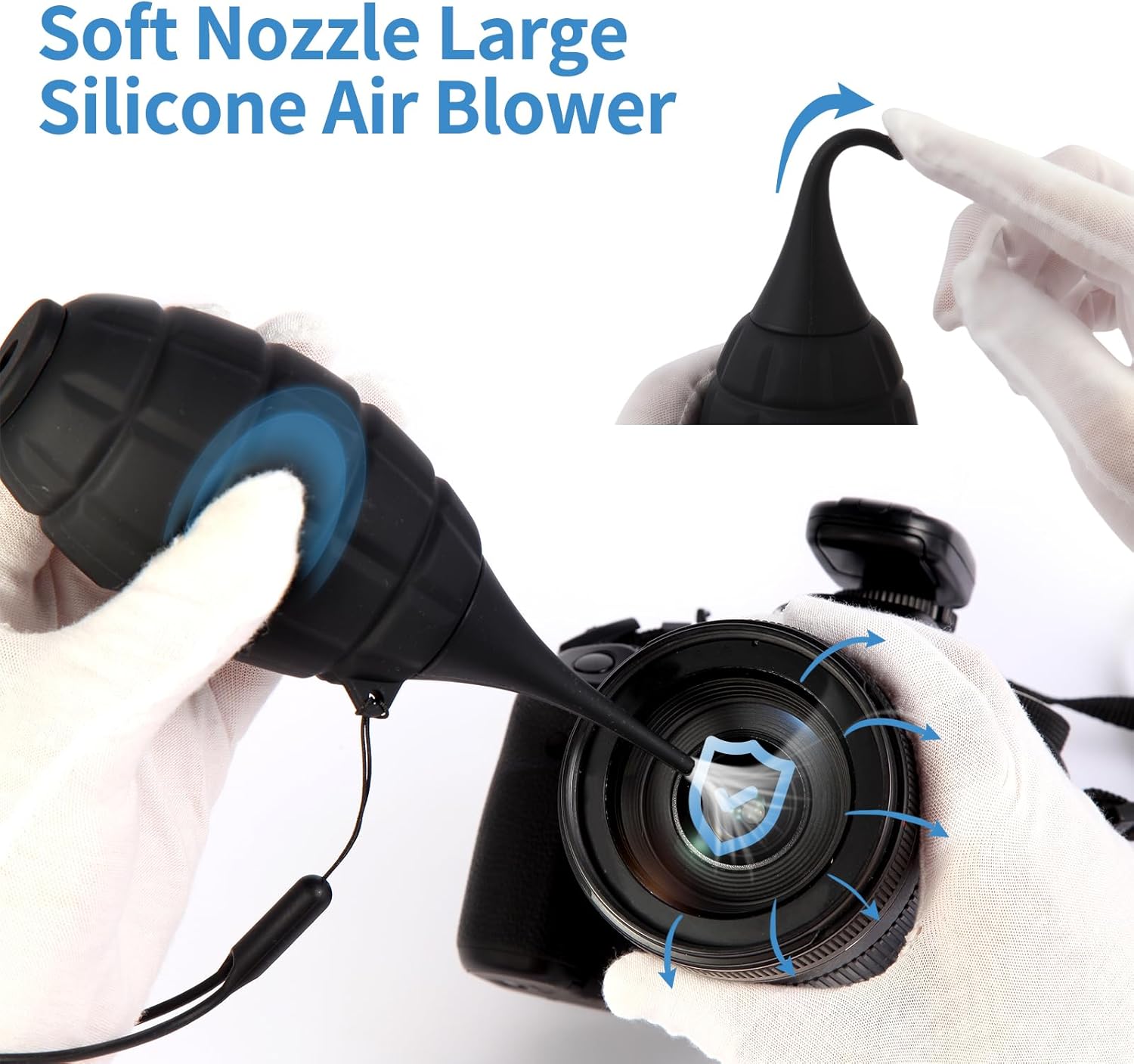 - Upgraded Advanced Large Silicone Air Blower: Larger size with a longer tip for cleaning not just lenses, but also coffee machines, keyboards, digital camera and other equipment. The soft silicone airbag offers comfort, while the gentle tip ensures no scratches. Includes a silicone wrist strap for easy attachment to tripods or bags, making it the perfect on-the-go tools. The screen cleaner, electronic wipes, cleaning brush, keyboard cleaner, brush cleaner are useful cleaning supplies.