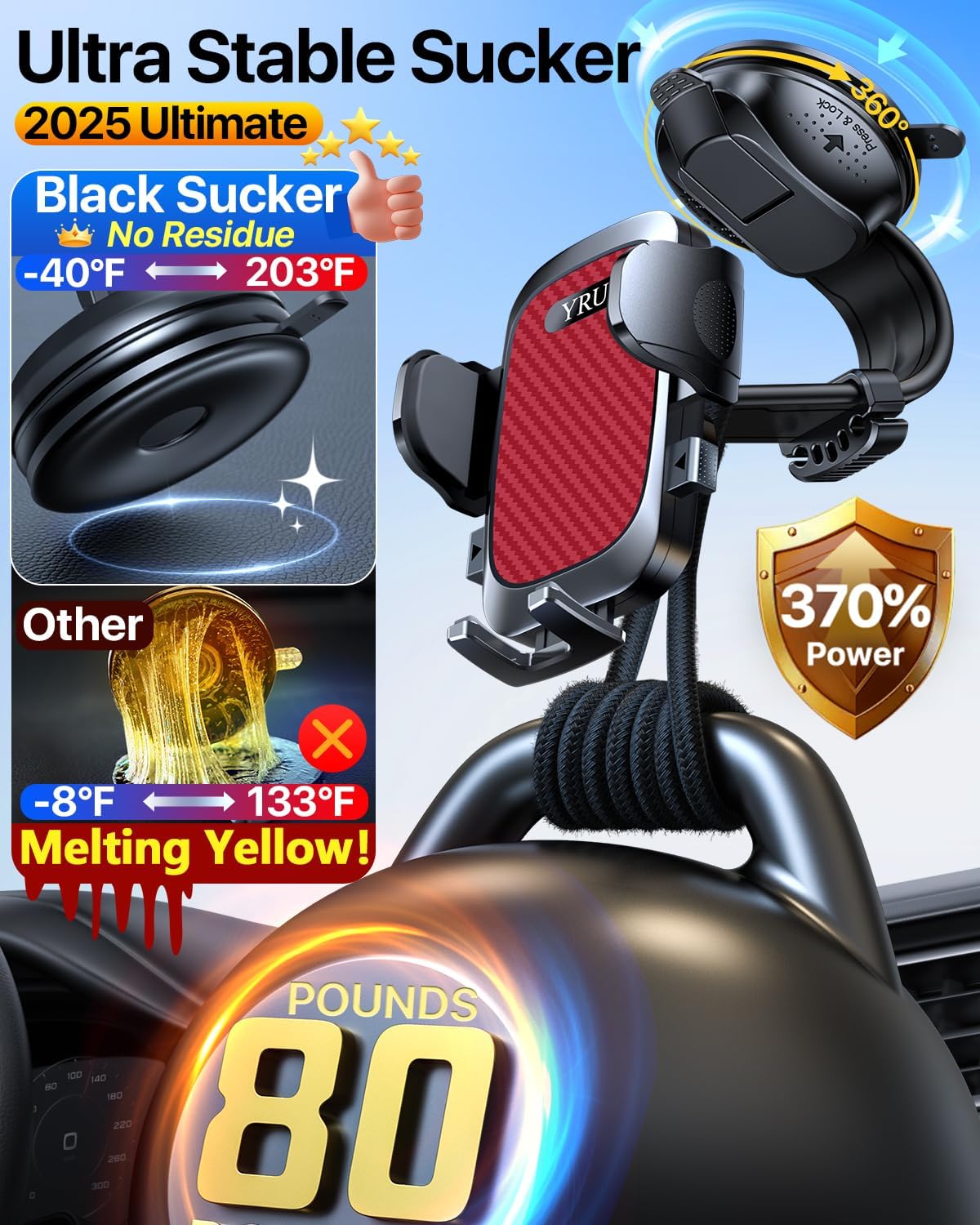 - Upgraded 80lbs Rotatable Sucker, Ultra Stable & Reusable: The phone car mount suction is up to 80lbs stable. Made of German nano adhesive material (temperature resistant -40°-203°F). 360° rotatable in any direction. Not Drop, Not Melt, Removable, Washable, and Reusable