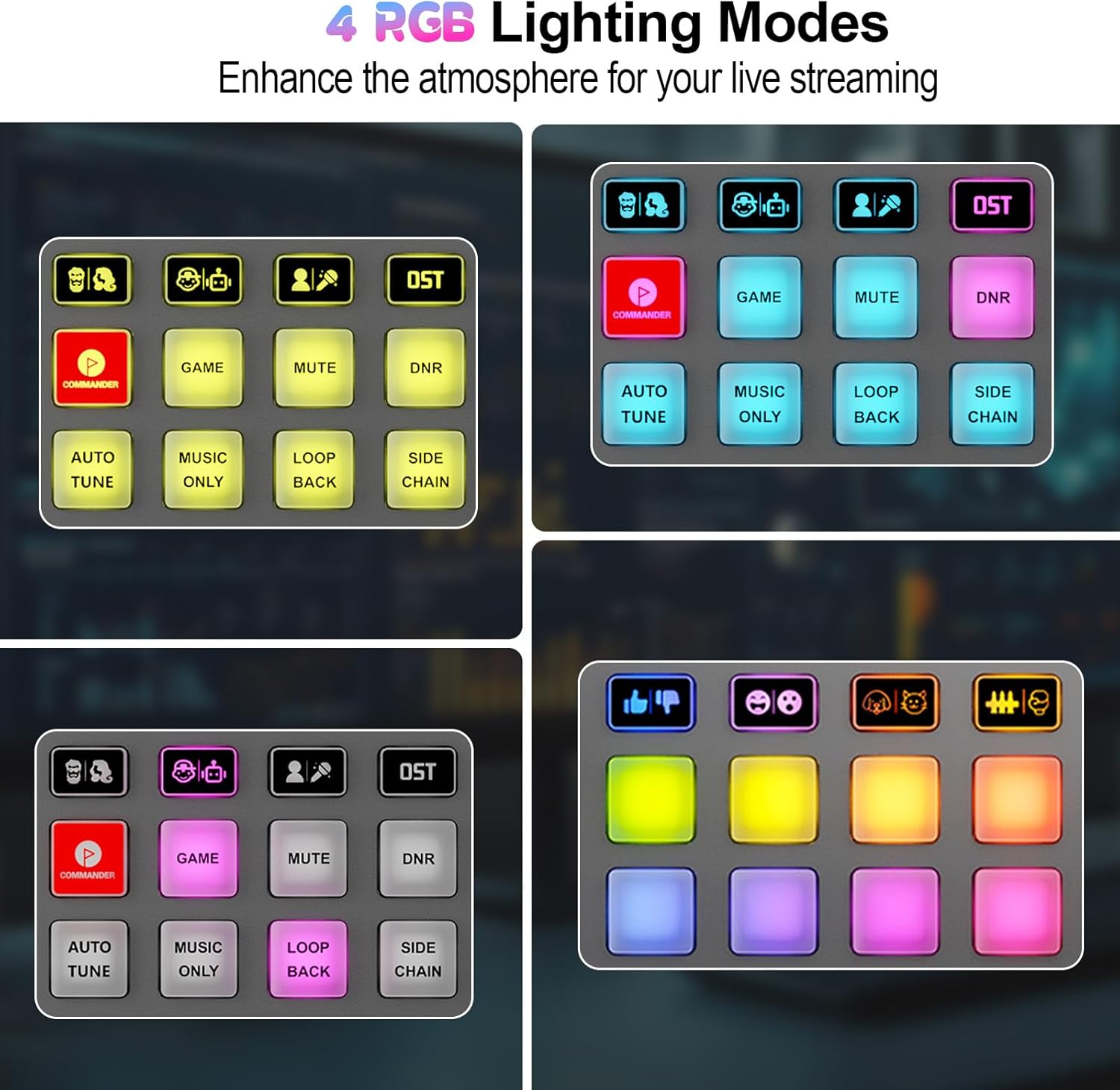 - One Click Control Function Keys: Practical functions such as gaming, mute, noise reduction, and automatic tuning are all equipped with independent hardware keys. These multifunctional keys can be controlled with one click without software intervention, greatly improving the efficiency of live streaming creation and allowing broadcasters to easily grasp the live streaming status, thereby enhancing live streaming efficiency