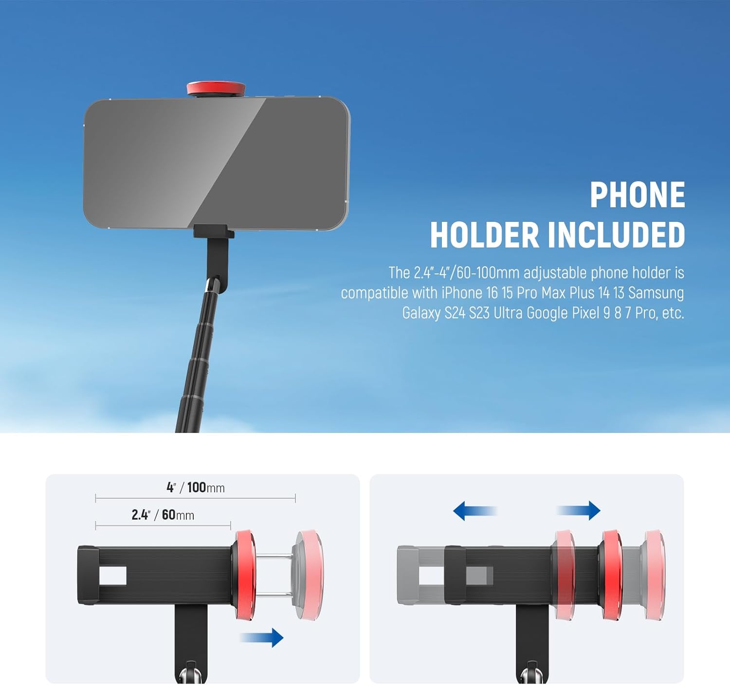 - Integrated phone clip: the high tri pod tripod with a 60 to 100 mm adjustable phone holder for content creators is compatible with iPhone 16 15 Pro Max Plus i Phone 14 13 smartphones Samsung Galaxy S25 S24 S23 Ultra Google Pixel 9 8 7 Pro Android mobile phone. Ideal tripod for photographic equipment or accessories to improve mobile phone camera shots