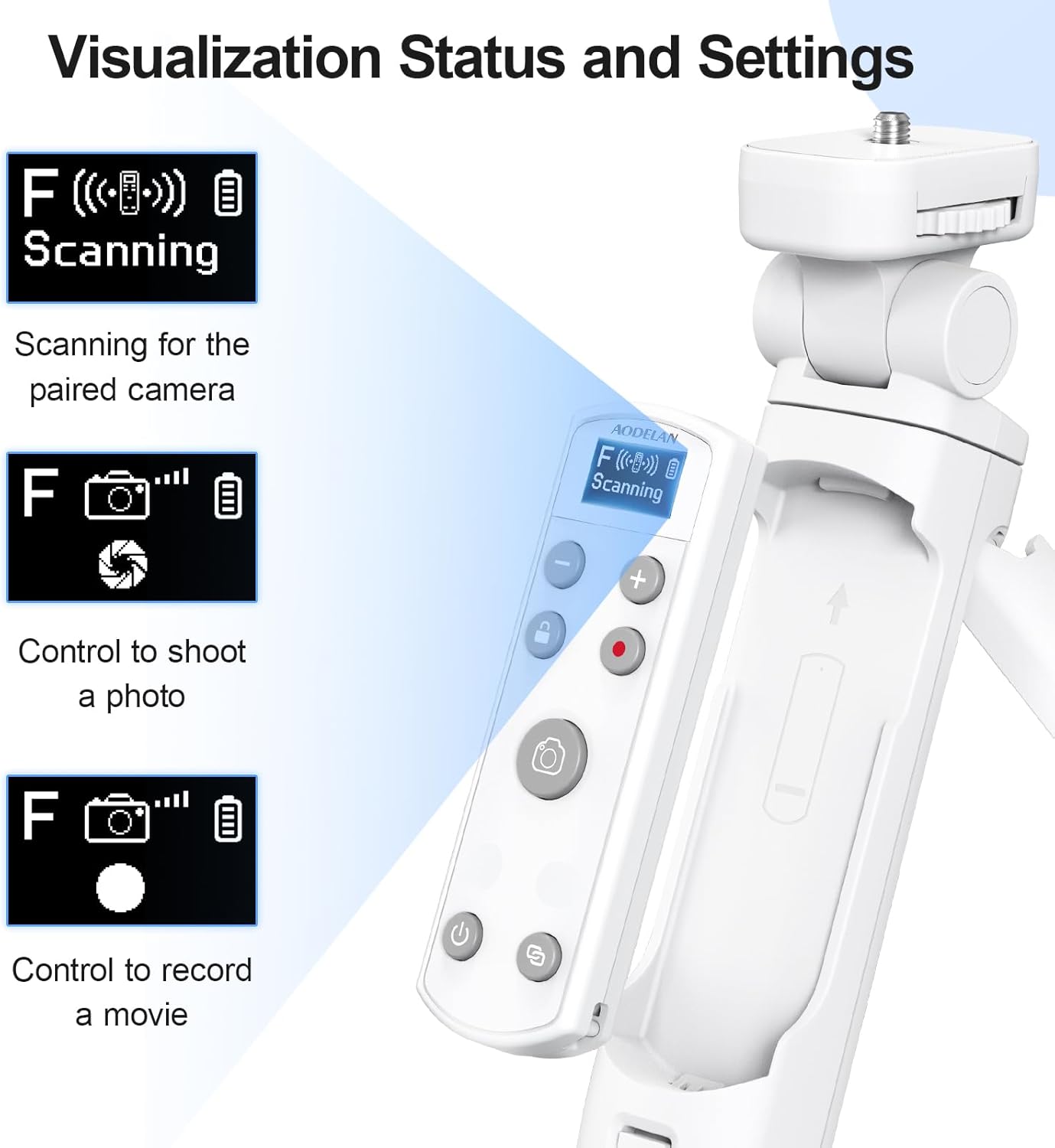 - Multi Functional Wireless Remote Control: The AODELAN shooting tripod is equipped with a wireless remote control, which can be remotely controlled without touching the camera.This remote control supports shooting still photos, short videos, Bulb shooting, continuous shooting, self timer, zoom and press the button halfway to focus (the camera needs to be set to AF (auto focus) mode). The zoom function is available only for power zoom lenses and when the camera supports remote zoom. It has a 360 ° omni-directional remote control, and the remote control distance can reach 10m/32.8 feet. Please adjust the camera to the appropriate mode.