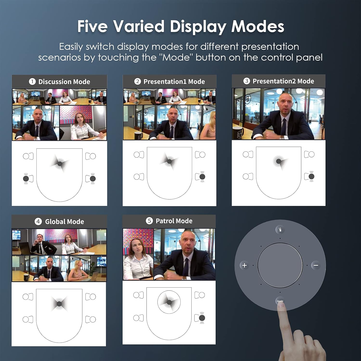 - ă8 Mics & Dual 10W Speakerphonesă8 omnidirectional microphones pick up voice up to 18ft away, filter out background noise and echo, and deliver crystal-clear audio. Integrated dual 10w full-duplex speakerphones remove interference noise and echo and transmit crisp sound so you can hear the other party clearly. Volume+ / Volume- / Mute buttons on the camera panel are convenient to control audio volume and mute the microphones during the meeting.