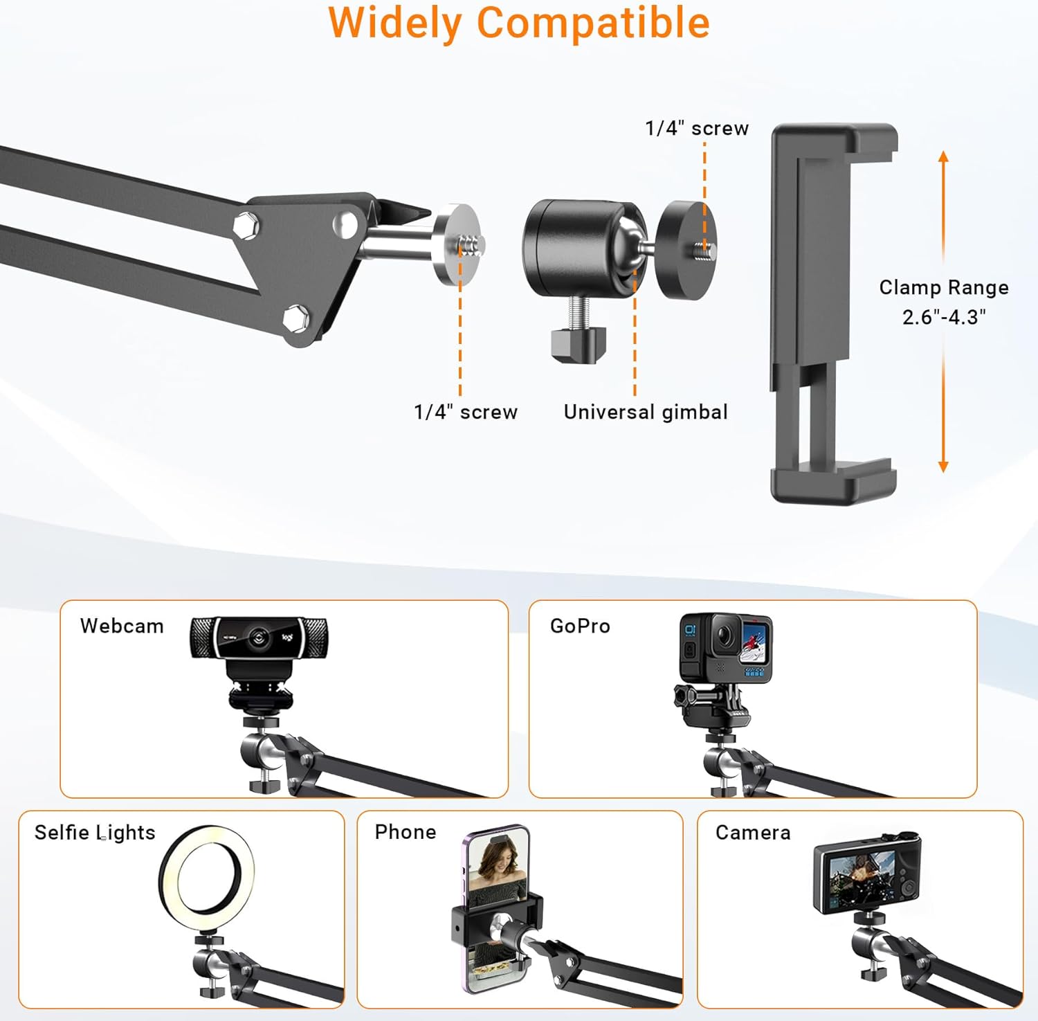 - 3-Section mount : Designed for overhead camera desktop mounting, this product includes a 1/4" screw, phone holder, and 360° ball head. The overhead camera mount arm is space-saving and allows the base to rotate 360°, offering excellent flexibility for improved shooting angles and overhead lighting.