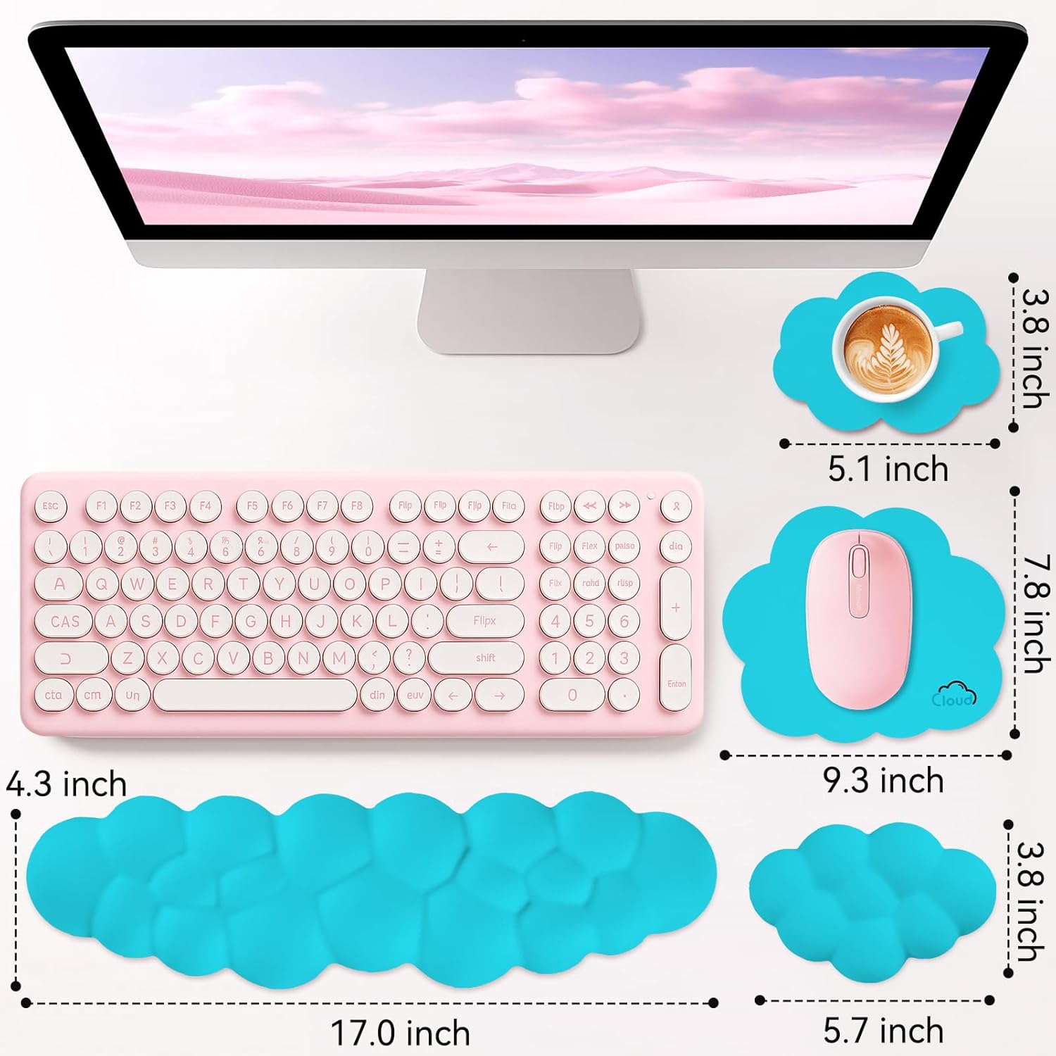 - 4-in-1 Cute Desk Accessory Set: Includes a keyboard wrist rest, mouse wrist rest , mouse pad, and a matching cloud coaster. This complete four-piece set offers ergonomic comfort and comes in a stylish gift box, making it suitable for desktop and laptop setups—whether for gaming, home office, or as a thoughtful gift