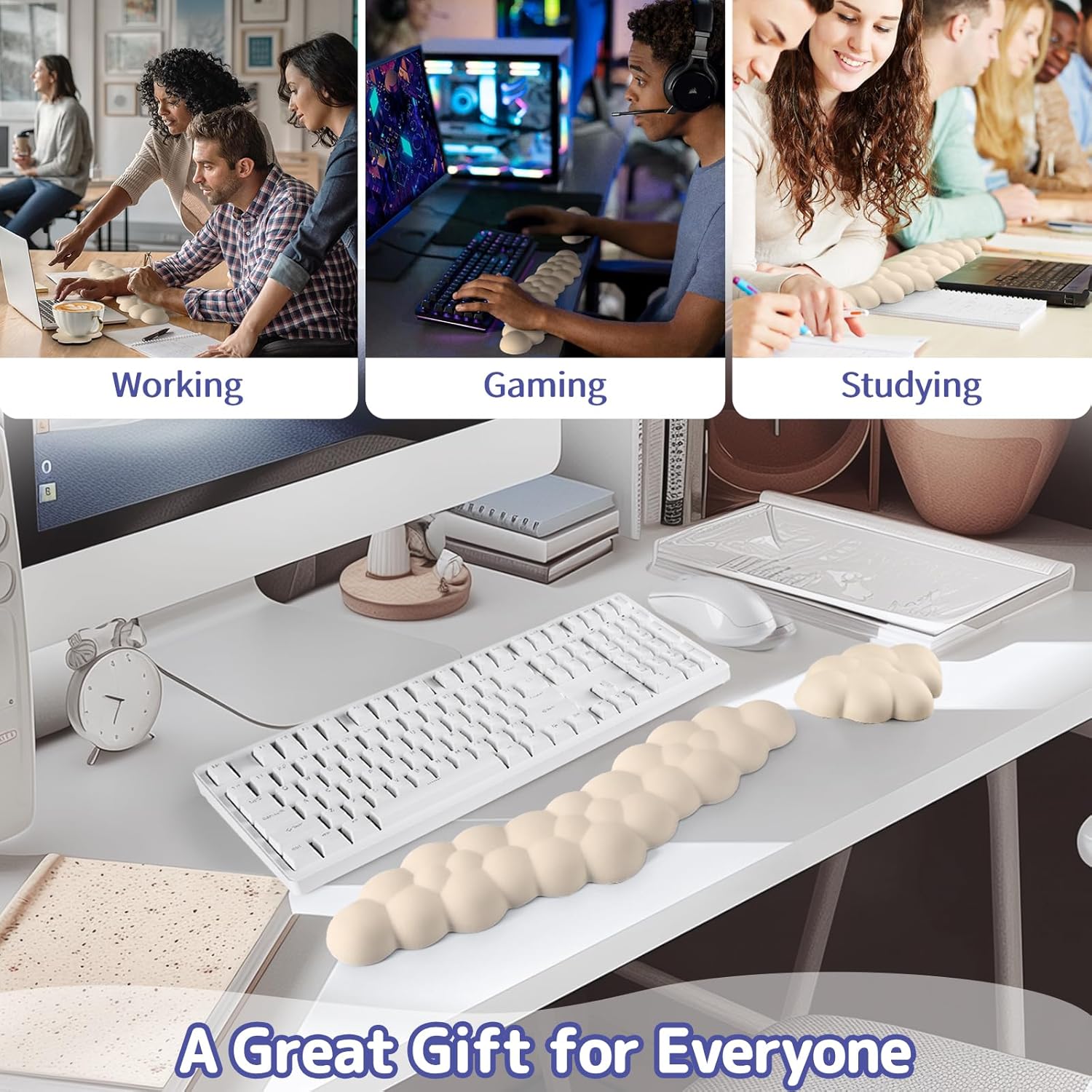 - 3-in-1 Cloud Desk Set:This 3-piece cute desk accessory set includes a keyboard wrist rest, a matching mouse wrist rest, and a cloud-shaped coaster. Designed for both function and aesthetics, it's a thoughtful office gift for family, friends and teachers, or coworkers who want to add comfort and style to their workspace