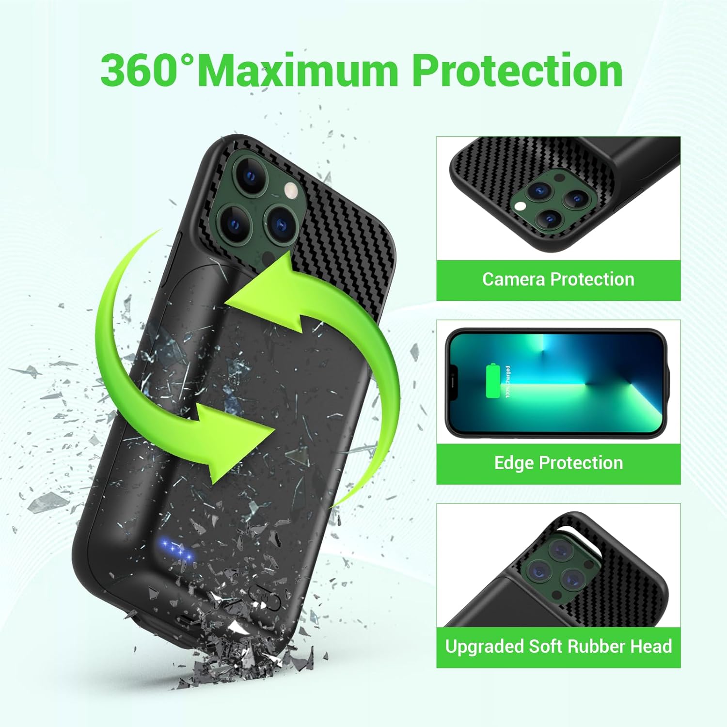 - 【Safe Charging and indicator】The LED indicator lets you know the charging status (0%-25%-50%-75%-100%). Our battery case is designed to charge for iPhone 80% first before charging the battery case. Enjoy hassle-free charging of the battery case and your phone together without removing the case.