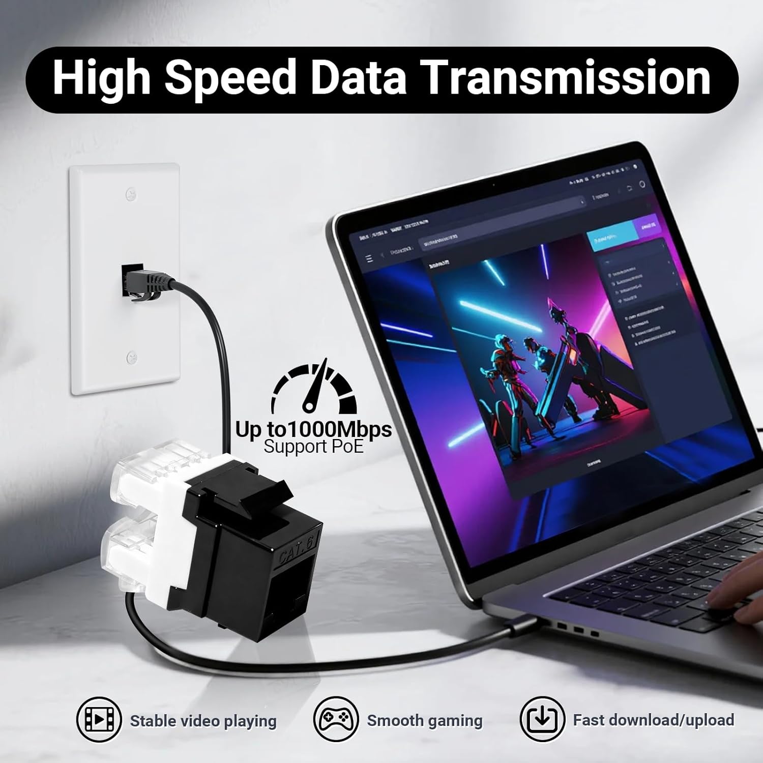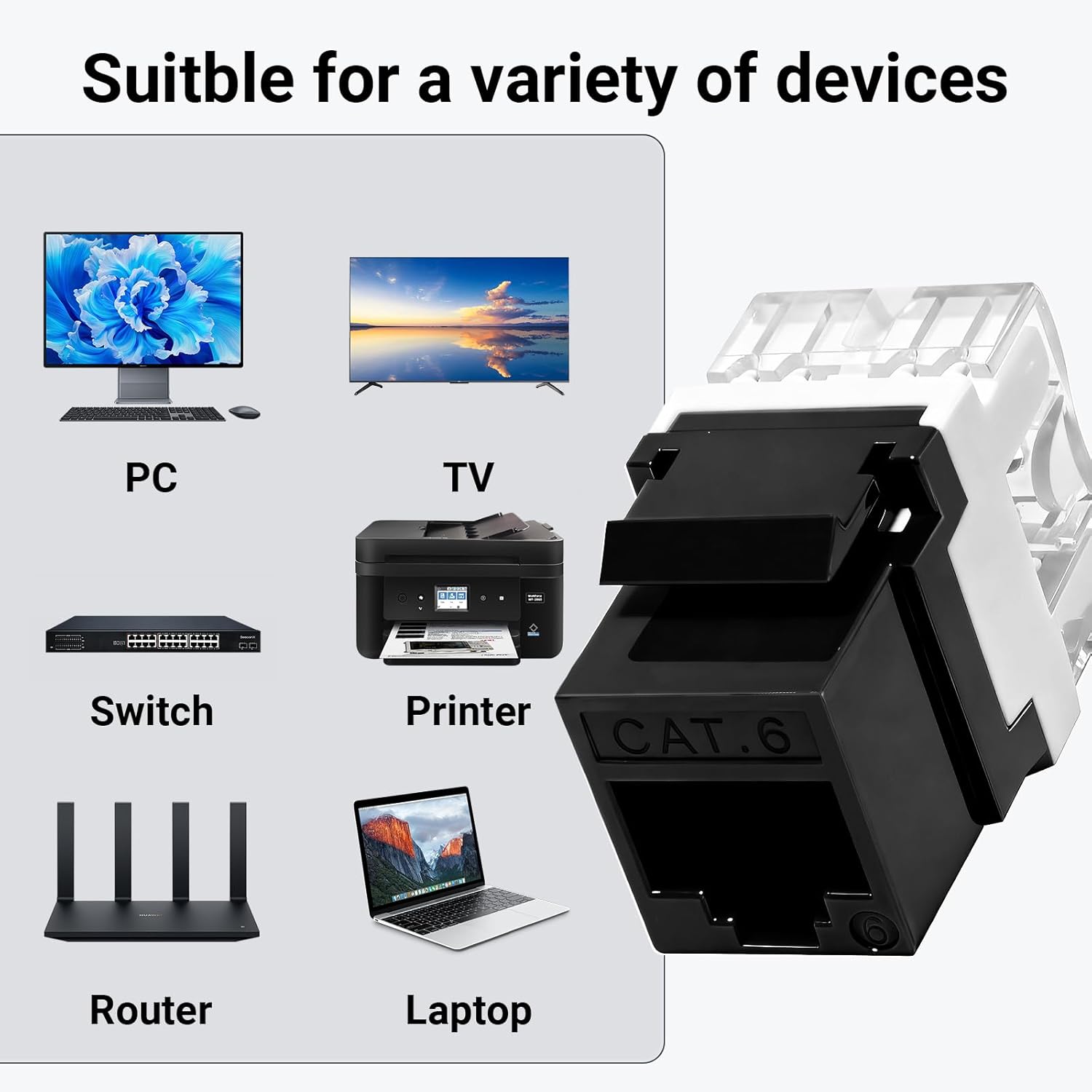 - 【Applications】Cat6 female to female keystone jack supports unshielded twisted pair (UTP)CAT6/CAT5E/CAT5 ethernet cable, suitable for avariety of devices,such as laptop, printer, router, switch, tv and so on